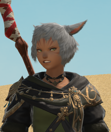 I'naaya is the leader of the Nine Claws colony. Her home tribe, the I tribe, was destroyed by strife when she was twelve years old. She survived on the city streets of Ala Mhigo, learning to adjust to the unfamiliar culture she was suddenly thrown into. She met P'vhoza after the imperial annexation, and together they left Ala Mhigo, travelling around Eorzea for a while before settling in Mor Dhona. But after the Battle of Silvertear Skies, she, along with the many other refugees who had built a home in Mor Dhona, were once again displaced - this time to Little Ala Mhigo. There she proposed a plan to her fellow Seeker refugees to start a new tribe out in the Thanalan desert. She is an exceptionally skilled hunter.